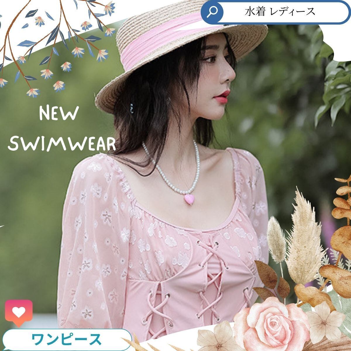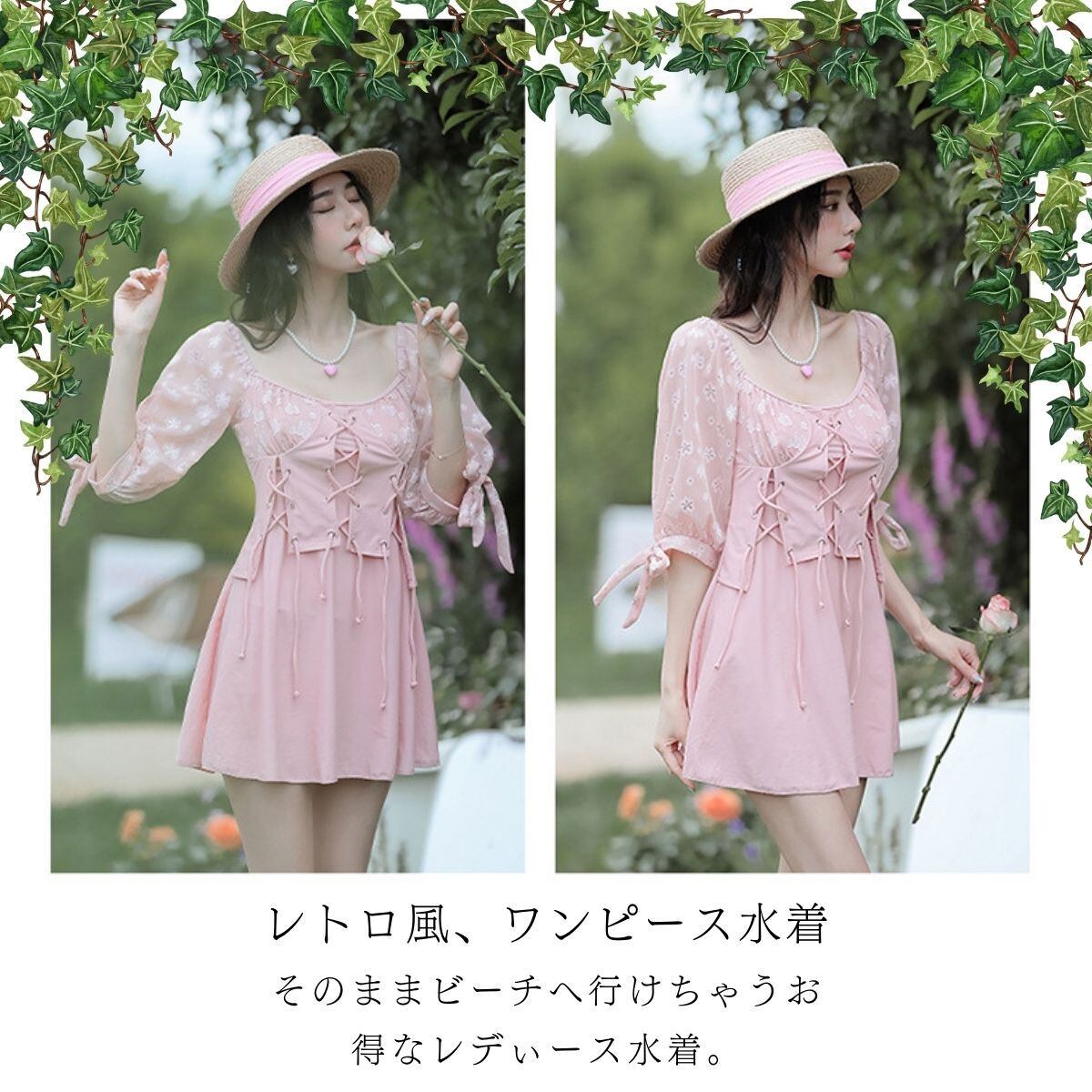 ワンピース レディース 水着 パフスリーブ 半袖 Uネック 水着 ビスチェ風 バックシャン ウエストマーク 水着 体型カバー フレア スカート おしゃれ 可愛い 温泉水着 旅行水着 プール ビーチ 女性用 水泳服 スイムウエアー | Winsuteki